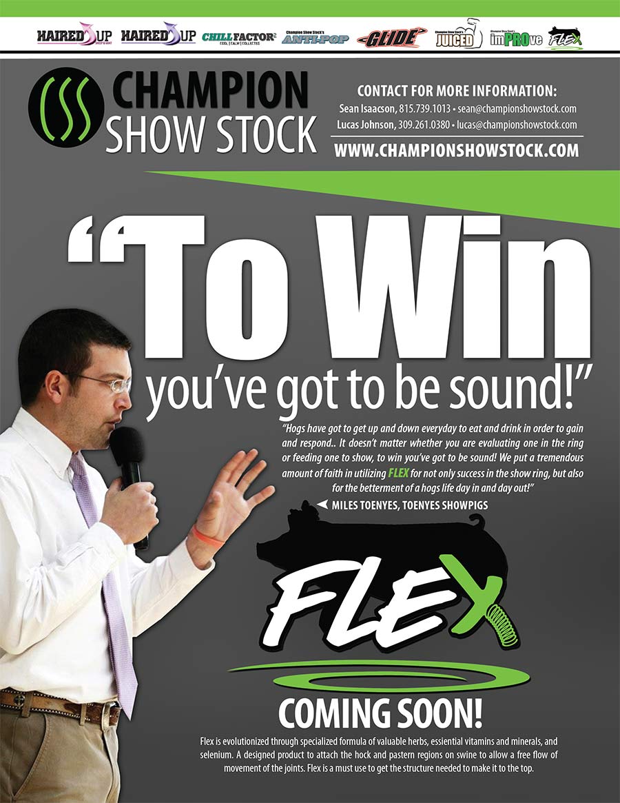 “Hogs have got to get up and down everyday to eat and drink in order to gain and respond.. It doesn’t matter whether you are evaluating one in the ring or feeding one to show, to win you’ve got to be sound! We put a tremendous amount of faith in utilizing FLEX for not only success in the show ring, but also for the betterment of a hogs life day in and day out!”